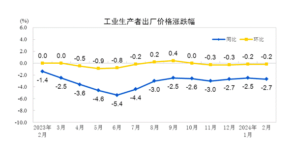 PPI方面,2月份受春节假日等因素影响,工业生产处于传统淡季,全国PPI环比下降0.2%,降幅与上月相同;同比下降2.7%,降幅略有扩大。