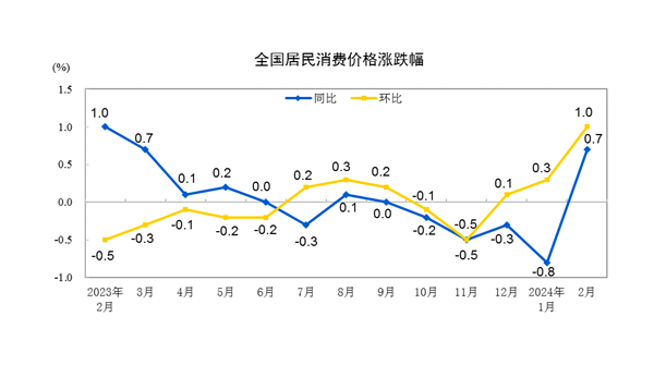 国家统计局3月9日发布的数据显示,2月份,全国CPI环比上涨1.0%,涨幅比上月扩大0.7个百分点;同比由上月下降0.8%转为上涨0.7%,回升较多。扣除食品和能源价格的核心CPI同比上涨1.2%,涨幅比上月扩大0.8个百分点,为2022年2月以来最高涨幅。