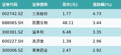 鼎峰优配该基金近五个交易日净值(复权单位净值,下同)下跌1.06%,近一个月净值下跌7.09%。该基金自(20210708)成立以来净值增长率为-63.72%,管理人为易方达基金管理有限公司,基金经理为张湛。截至午间收盘,生物医药主题涨跌幅最高的五只股票为:三圣股份(002742.SZ)、凯赛生物(688065.SH)、溢多利(300381.SZ)、圣济堂(600227.SH)与莱美药业(300006.SZ)。详情见下表: